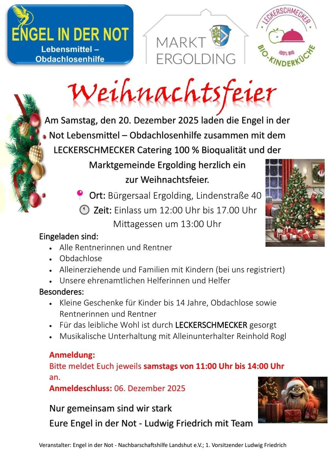 Ergolding,– „Ein Fest der Wärme und Hoffnung“ – unter diesem Motto lädt die Hilfsorganisation „Engel in der Not“ auch dieses Jahr herzlich zum großen Weihnachtsfest ein! Am 20. Dezember 2025 verwandelt sich der Bürgersaal in Ergolding ab 12:00 Uhr in einen Ort voller Freude, Geborgenheit und weihnachtlicher Magie.